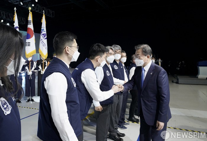 [사천=뉴스핌]문재인 대통령이 9일 경남 사천시 고정익동 한국항공우주산업(KAI)에서 열린 한국형전투기 'KF-21 보라매' 시제기 출고식에서 개발자들을 격려하고 있다. [사진=청와대] 2021.04.09 photo@newspim.com
