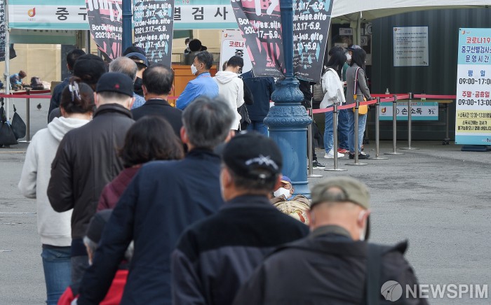 [서울=뉴스핌] 정일구 기자 = 신종 코로나바이러스 감염증(코로나19) 확진자 수가 사흘째 600명대를 기록한 11일 서울 중구 서울역 광장에 마련된 임시 선별검사소에서 시민들이 검사를 받기 위해 줄지어 서있다. 중앙방역대책본부는 이날 0시 기준 국내 신규 확진자가 614명 늘어 누적 10만9559명이라고 밝혔다. 2021.04.11 mironj19@newspim.com