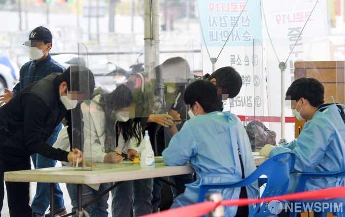 [서울=뉴스핌] 정일구 기자 = 신종 코로나바이러스 감염증(코로나19) 확진자 수가 사흘째 600명대를 기록한 11일 서울 중구 서울역 광장에 마련된 임시 선별검사소에서 시민들이 검사를 받기 위해 줄지어 서있다. 중앙방역대책본부는 이날 0시 기준 국내 신규 확진자가 614명 늘어 누적 10만9559명이라고 밝혔다. 2021.04.11 mironj19@newspim.com