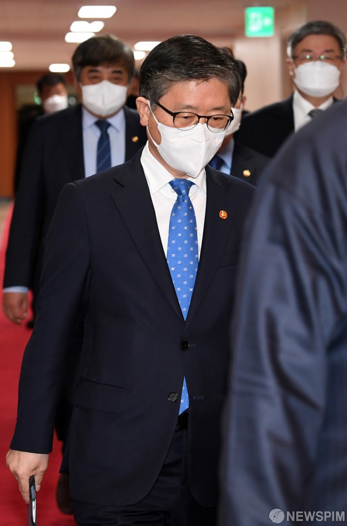 [서울=뉴스핌] 김학선 기자 = 변창흠 국토교통부 장관이 13일 서울 종로구 정부서울청사에서 열린 국무회의에 참석하고 있다. 2021.04.13 yooksa@newspim.com