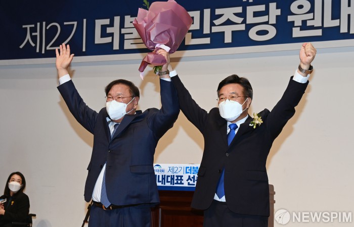 [서울=뉴스핌] 최상수 기자 = 16일 서울 여의도 국회 의원회관에서 열린 제2기 더불어민주당 원내대표 선출 의원총회에서 윤호중 신임 원내대표가 김태년 전 원내대표와 손을 들어 보이고 있다. 2021.04.16 kilroy023@newspim.com