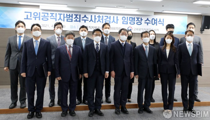 [과천=뉴스핌] 최상수 기자 = 김진욱 공수처장을 비롯한 검사들이 16일 오후 경기도 과천정부청사에서 열린 공수처 검사 임명장 수여식에서 기념촬영을 하고 있다. 사진 앞줄 왼쪽부터 반시계방향으로 예상균 검사, 김성문 부장검사, 김진욱 공수처장, 여운국 공수처 차장, 최석규 부장검사, 김숙정 검사, 문형석 검사, 이종수 검사, 박시영 검사, 김송경 검사, 김수정 검사, 이승규 검사, 최진홍 검사, 김일로 검사, 허윤 검사. 2021.04.16 kilroy023@newspim.com