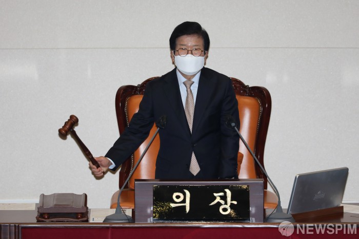 [서울=뉴스핌] 최상수 기자 = 박병석 국회의장이 20일 오후 서울 여의도 국회 본회의장에서 열린 제386회(임시회) 제2차 본회의에서 개의 선언을 하고 있다. 2021.04.20 kilroy023@newspim.com