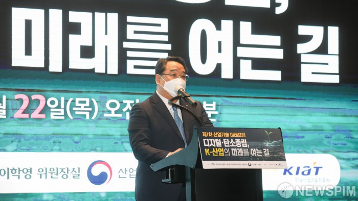 [서울=뉴스핌] 최상수 기자 = 석영철 한국산업기술진흥원장이 22일 오전 서울 여의도 글래드호텔에서 열린 제1차 산업기술 미래포럼 '디지털·탄소중립, K-산업의 미래를 여는길'에서 인사말을 하고 있다. 2021.04.22 kilroy023@newspim.com