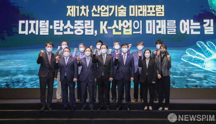[서울=뉴스핌] 최상수 기자 = 성윤모 산업통상자원부 장관, 이학영 국회 산업통상자원중소벤처기업위원장, 석영철 한국산업기술진흥원장을 비롯한 참석자들이 22일 오전 서울 여의도 글래드호텔에서 열린 제1차 산업기술 미래포럼 '디지털·탄소중립, K-산업의 미래를 여는길'에 기념촬영을 하고 있다. 2021.04.22 kilroy023@newspim.com