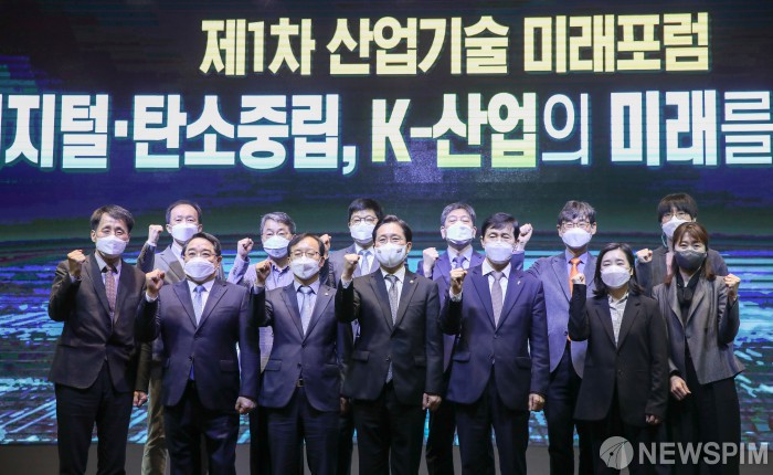 [서울=뉴스핌] 최상수 기자 = 성윤모 산업통상자원부 장관, 이학영 국회 산업통상자원중소벤처기업위원장, 석영철 한국산업기술진흥원장을 비롯한 참석자들이 22일 오전 서울 여의도 글래드호텔에서 열린 제1차 산업기술 미래포럼 '디지털·탄소중립, K-산업의 미래를 여는길'에 기념촬영을 하고 있다. 2021.04.22 kilroy023@newspim.com