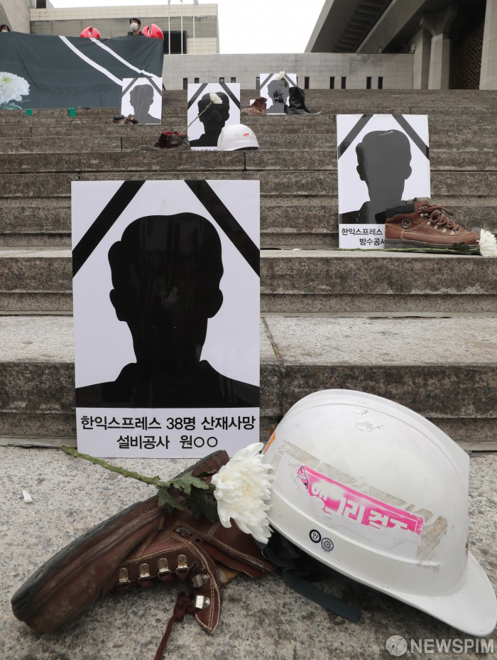 [서울=뉴스핌] 김학선 기자 = 산재사망대책마련공동캠페인단 등 노동단체가 28일 서울 광화문 세종문화회관 계단에서 '2021년 최악의 살인기업 선정식'을 열고 있다. 2021.04.28 yooksa@newspim.com