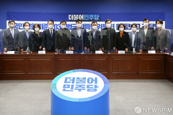 [서울=뉴스핌] 이형석 기자 = 홍익표-김연명 공동위원장 등 참가자들이 30일 국회 의원회관에서 열린 더불어민주당 국민생활기준 2030 범국민특별위원회 활동보고 간담회에 앞서 기념촬영하고 있다. 2021.04.30 leehs@newspim.com