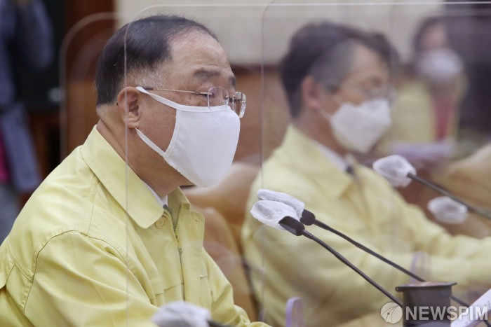 [서울=뉴스핌] 김학선 기자 = 홍남기 국무총리 직무대행이 12일 서울 종로구 정부서울청사에서 열린 코로나19 대응 중앙재난안전대책본부 회의에서 모두발언을 하고 있다. 2021.05.12 yooksa@newspim.com