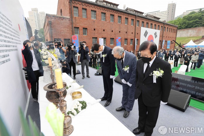 [서울=뉴스핌] 백인혁 기자 = 오세훈 서울시장, 박석무 행사위원장, 박병석 국회의장이 18일 오전 서울 서대문구 서대문형무소 역사관마당에서 열린 5·18민중항쟁 제41주년 서울기념식에서 묵념을 하고 있다. 2021.05.18 dlsgur9757@newspim.com