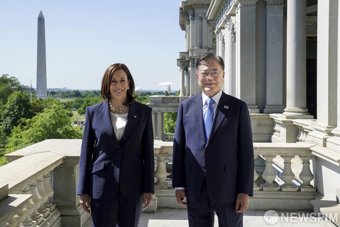 [서울=뉴스핌] 문재인 대통령이 21일(현지시간) 백악관 아이젠하워 행사실에서 카말라 데비 해리스(Kamala Devi Harris) 미국 부통령을 접견하고 있다. [사진=청와대] 2021.05.22 photo@newspim.com