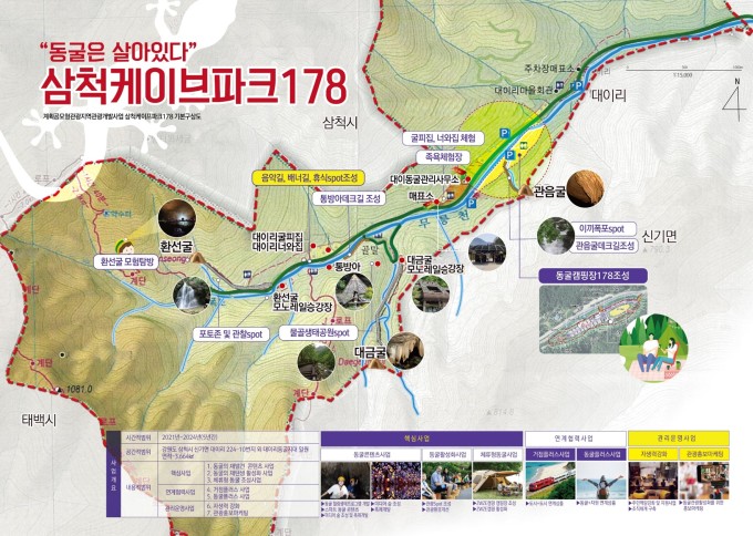 25일 시에 따르면 문화체육관광부가 주관한 지역관광개발 공모사업에 강원도에서 유일하게 선정되면서 4년간 120억원을 들여 삼척의 관광자원인 대이리지대의 동굴과 문화자원을 활용한 '동굴은 살아있다' 삼척케이브파크 178 조성사업을 추진한다.