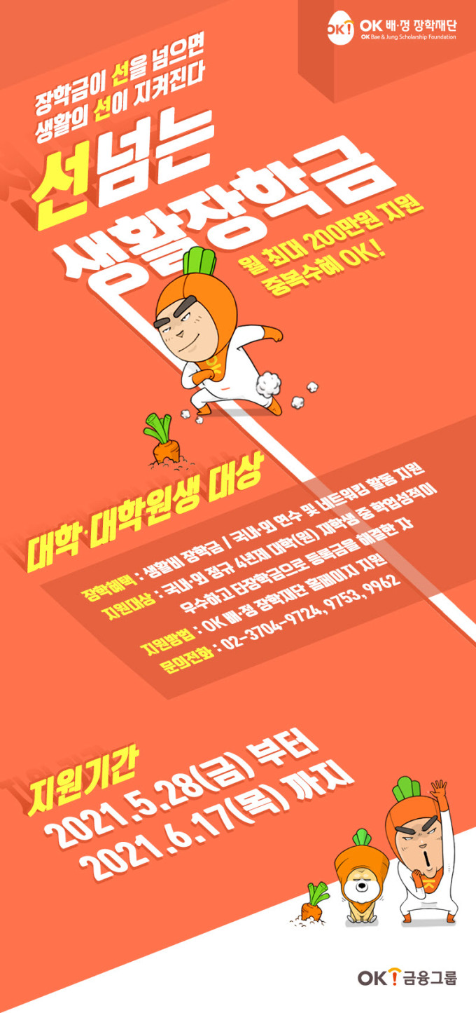 이번 장학생 모집은 전액 장학금으로 등록금을 해결한 자를 대상으로 진행된다. OK배정장학재단은 서류 합격자를 대상으로 면접 전형을 거쳐 오는 7월 중순 중 최종 합격자를 선발한다는 계획이다.