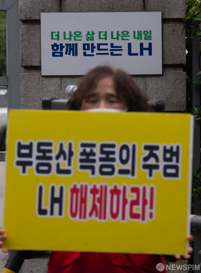 [서울=뉴스핌] 윤창빈 기자 = 전국철거민협의회 중앙회 등 시민단체들이 31일 오전 서울 강남구 한국토지주택공사 서울지역본부 앞에서 ‘LH 퇴출하여 부동산투기공화국 해체하자’ 기자회견을 열고 피켓을 들고 있다. 2021.05.31 pangbin@newspim.com