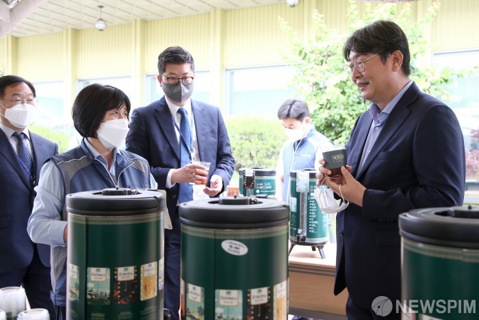 [서울=뉴스핌] 최상수 기자 = 이춘석 국회 사무총장(오른쪽)이 31일 금연의날을 맞아 국회 하늘정원에서 전국공무원노조 국회사무처지부가 주최한 커피무료나눔 행사에서 참석해 이은희 국회노조본부 본부장과 대화하고 있다. 2021.05.31 kilroy023@newspim.com