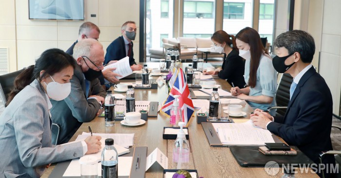 [서울=뉴스핌]나승식 산업통상자원부 통상차관보가 1일 오전 서울 포시즌스호텔에서 게리 그림스톤(Gerry Grimstone) 영국 국제통상부 투자 담당 국무상을 면담하고 있다.[사진= 산업통상자원부 ] 2021.06.01 photo@newspim.com