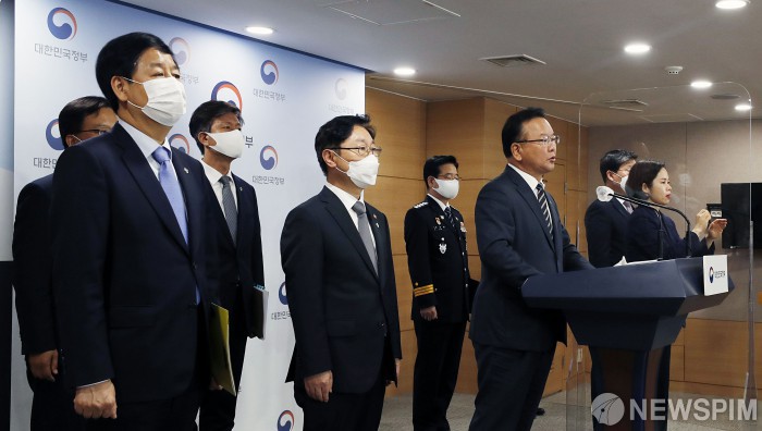 [서울=뉴스핌] 김학선 기자 = 김부겸 국무총리가 2일 서울 종로구 정부서울청사에서 부동산 투기 조사 및 수사 중간결과 브리핑을 하고 있다. 2021.06.02 yooksa@newspim.com
