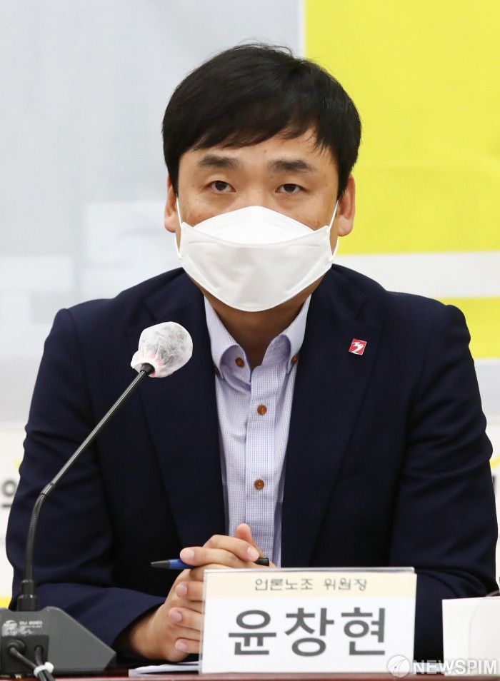 [서울=뉴스핌] 이형석 기자 = 윤창현 전국언론노조 위원장이 3일 국회에서 열린 '정의당-전국언론노동조합 정책간담회'에서 인사말을 하고 있다. 2021.06.03 leehs@newspim.com