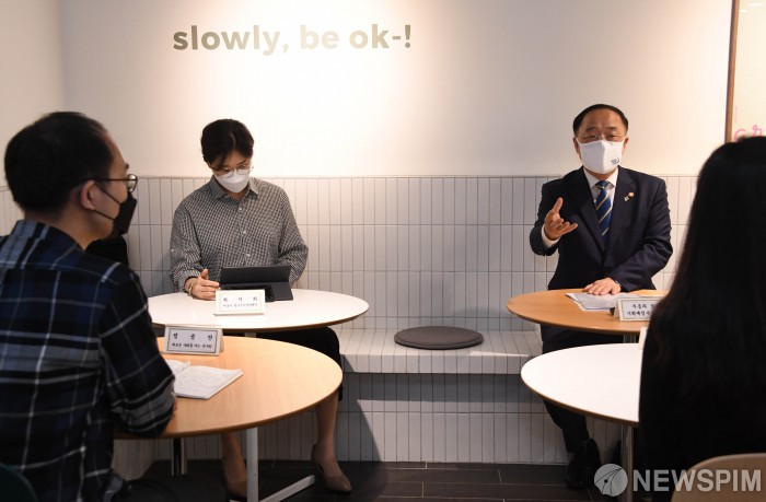 [서울=뉴스핌]홍남기 부총리 겸 기획재정부 장관이 3일 오후 부동산 관련 현장방문 일환으로 호텔 리모델링 청년주택인 서울 영등포 아츠스테이를 방문해 정책수요자의 입장에서 정책현장을 점검한 후 청년위원, 입주자 등 관계자들과 간담회를 하고 있다.[사진=기획재정부 ] 2021.06.03photo@newspim.com