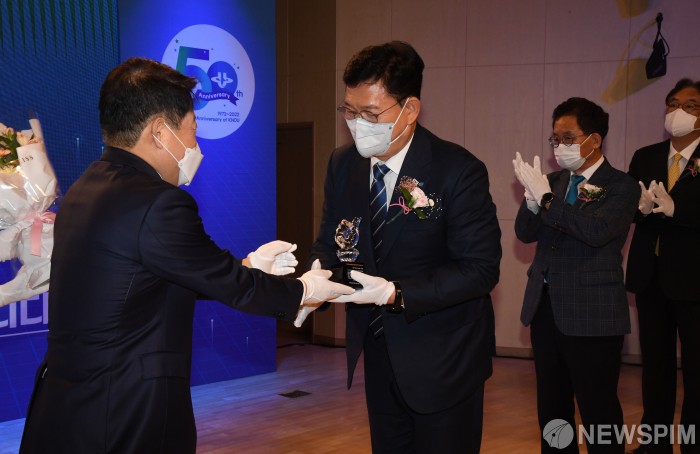 [서울=뉴스핌] 국회사진취재단 = 송영길 더불어민주당 대표가 3일 서울 종로구 한국방송통신대학교에서 열린 '방송통신대법과 시행령 제정 최종보고회'에서 류수노 총장으로부터 기념패를 받고 있다. 2021.06.03 photo@newspim.com