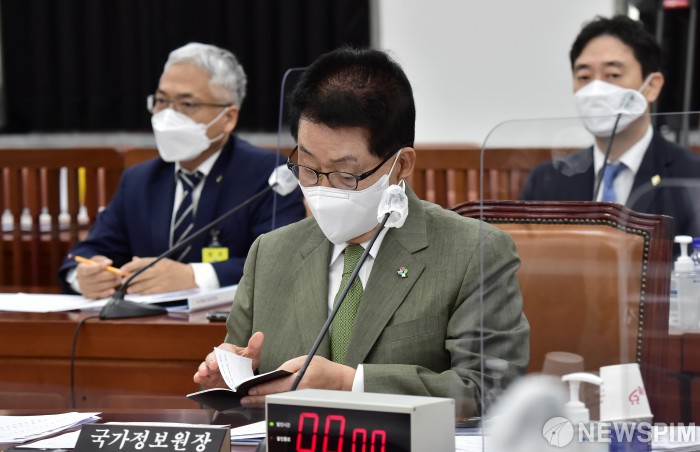 [서울=뉴스핌] 최상수 기자 = 박지원 국정원장이 9일 서울 여의도 국회 정보위원회에서 열린 국정원 불법사찰에 대한 자체 감찰 결과 보고 전체회의에 출석하고 있다. 2021.06.09 kilroy023@newspim.com