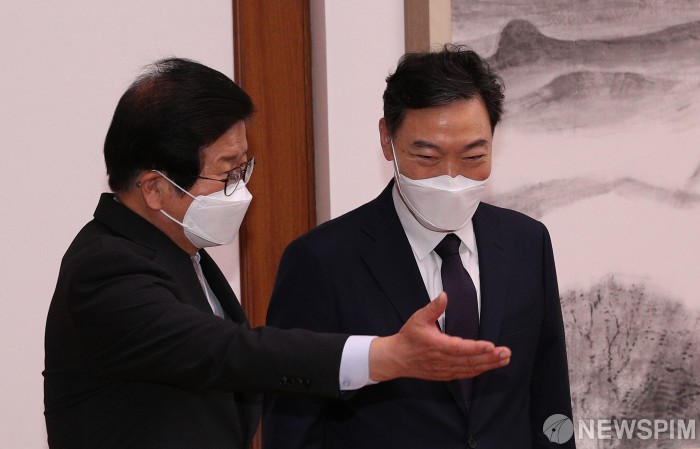 [서울=뉴스핌] 최상수 기자 = 박병석 국회의장(왼쪽)이 10일 오후 국회 의장실에서 취임 인사차 예방한 김오수 검찰총장을 자리로 안내하고 있다. 2021.06.10 kilroy023@newspim.com