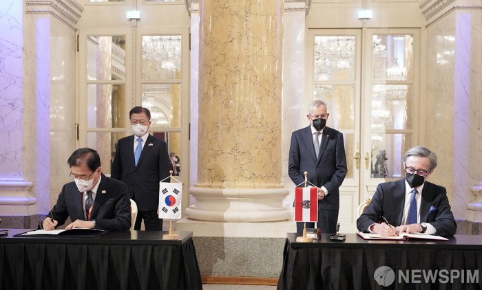 서울=뉴스핌; 문재인 대통령과 판 데어 벨렌 대통령이 지켜보는 가운데 14일 (현지시간) 비엔나 호프부르크궁에서 정의용 외무부 장관과 페터 라운스키 테펜탈 오스트리아 외교차관이 한국과 오스트리아 간의 문화협력협정문에 서명하고 있다.[사진=청와대] 2021.06.15 photo@newspim.com