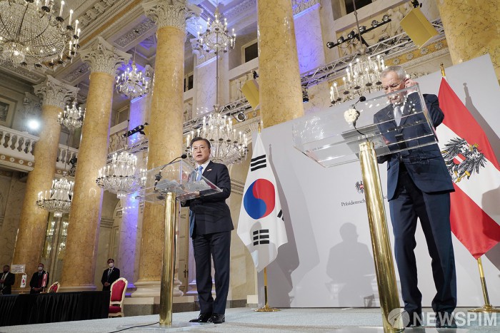 [서울=뉴스핌] 문재인 대통령이 14일 (현지시간) 비엔나 호프부르크궁에서 열린 판 데어 벨렌 오스트리아 대통령과의 정상회담후 공동 기자회견 하고 있다. [사진=청와대] 2021.06.15 photo@newspim.com