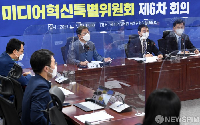 [서울=뉴스핌] 최상수 기자 = 송영길 더불어민주당 대표가 17일 서울 여의도 국회 의원회관에서 열린 미디어혁신특별위원회 제6차회의에서 발언하고 있다. 2021.06.17 kilroy023@newspim.com