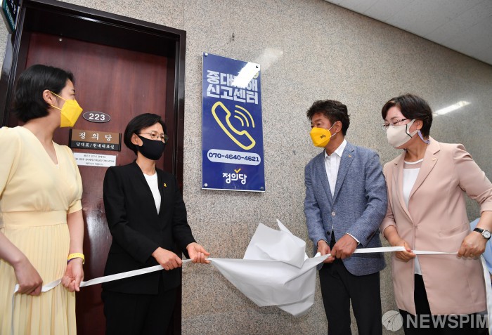 [서울=뉴스핌] 최상수 기자 = 정의당 여영국 대표(오른쪽에서 두 번째)가 22일 오전 서울 여의도 국회에서 열린 중대재해119신고센터 현판식에 참석해 류호정 의원, 강은미 의원, 박인숙 부대표와 현판을 가렸던 장막을 내리고 있다. 2021.06.22 kilroy023@newspim.com