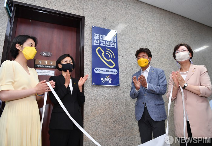 [서울=뉴스핌] 최상수 기자 = 정의당 여영국 대표(오른쪽에서 두 번째)가 22일 오전 서울 여의도 국회에서 열린 중대재해119신고센터 현판식에 참석해 류호정 의원, 강은미 의원, 박인숙 부대표와 현판을 가렸던 장막을 내리고 박수치고 있다. 2021.06.22 kilroy023@newspim.com