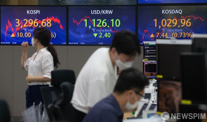 [서울=뉴스핌] 윤창빈 기자 = 30일 코스피 지수가 전일 대비 0.30% 상승한 3,296.68로 마감했다. 코스닥 지수는 전일 대비 0.73% 상승한 1,029.96으로 마감했다. 원·달러 환율은 전거래일보다 2.4원 내린 1126.1원에 거래를 마쳤다. 이날 오후 하나은행 딜링룸 전광판에 코스피지수가 표시되고 있다. 2021.06.30 pangbin@newspim.com