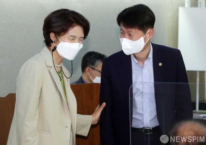 [서울=뉴스핌] 김학선 기자 = 한정애 환경부 장관과 김강립 식품의약품안전처장이 1일 서울 종로구 정부서울청사에서 열린 제12차 혁신성장 BIG3 추진회의에 참석해 대화하고 있다. 2021.07.01 yooksa@newspim.com