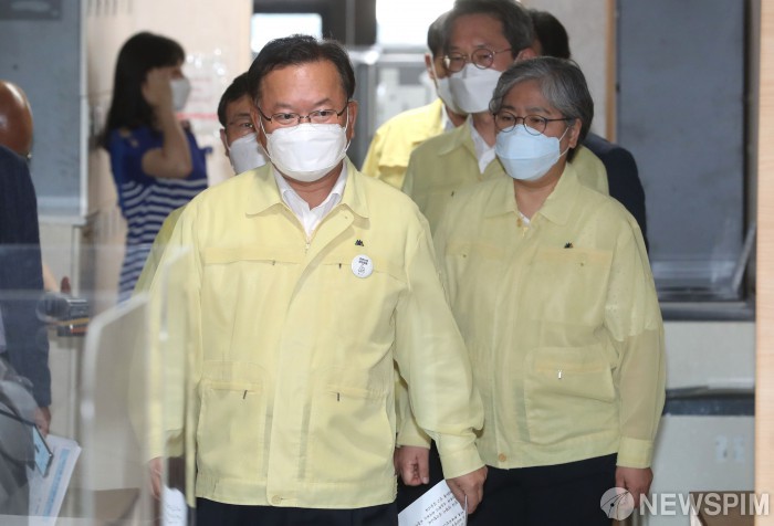 [서울=뉴스핌] 김학선 기자 = 김부겸 국무총리가 2일 서울 종로구 정부서울청사에서 코로나19 관련 대국민 담화문 발표를 위해 브리핑실로 들어서고 있다. 2021.07.02 yooksa@newspim.com