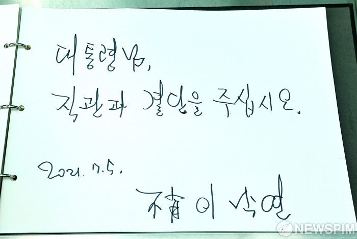 [서울=뉴스핌] 국회사진취재단 = 대선 출마를 공식 선언한 이낙연 더불어민주당 전 대표가 5일 오전 서울 동작구 국립서울현충원에서 김영삼 대통령 묘역을 참배 후 방명록에 '대통령님 직관과 결단을 주십시오' 라고 남겼다. 이 전 대표는 이날 오전 유튜브 '이낙연TV'를 통해 공식적으로 대선 출마 선언을 했다. 2021.07.05 photo@newspim.com