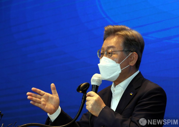 [서울=뉴스핌] 최상수 기자 = 이재명 경기도지사가 6일 오전 서울 여의도 글래드호텔에서 열린 ‘부동산 시장법 제정’ 국회토론회에서 참석하여 환영사를 하고 있다. 2021.07.06 kilroy023@newspim.com