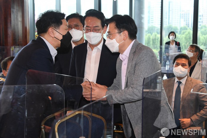 [서울=뉴스핌] 최상수 기자 = 유라시아 큰길 정책연구원(원장 원유철) 주최로 7일 여의도 마리나컨벤션 센터에서 열린 비전발표회에서 야권 대선 주자인 황교안 전 미래통합당 대표가 김기현 국민의힘 원내대표와 인사를 나누고 있다. 2021.07.07 kilroy023@newspim.com