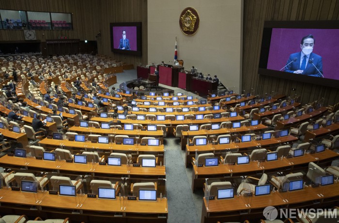 [서울=뉴스핌] 이형석 기자 = 박홍근 신임 예산결산위원장이 8일 국회 본회의에서 국민의힘 의원들이 퇴장한 가운데 인사말을 하고 있다. 2021.07.08 leehs@newspim.com