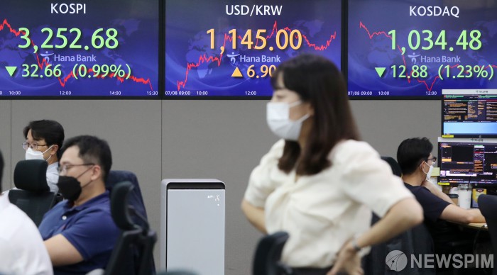 [서울=뉴스핌] 정일구 기자 = 8일 코스피 지수는 전 거래일(3285.34)보다 32.66포인트(0.99%) 내린 3252.68에 마감했다. 코스닥 지수는 전 거래일(1047.36)보다 12.88포인트(1.23%) 하락한 1034.48에 종료했다. 원·달러 환율은 전 거래일(1138.1원)보다 6.9원 오른 1145.0원에 장을 마쳤다. 이날 오후 서울 중구 하나은행 딜링룸에서 딜러들이 업무를 보고 있다. 2021.07.08 mironj19@newspim.com