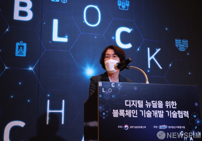 [서울=뉴스핌] 임혜숙 과학기술정보통신부 장관이 16일 오후 부산광역시 해운대구 파크하얏트부산호텔에서 열린 '디지털뉴딜을 위한 블록체인 기술개발 기술협력 설명회' 에 참석해 축사를 하고 있다.[사진=과학기술정보통신부] 2021.07.16 photo@newspim.com