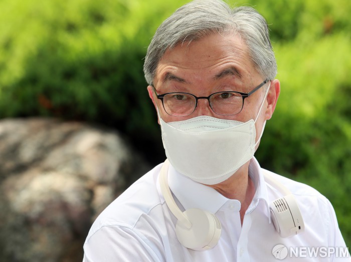[서울=뉴스핌] 이형석 기자 = 최재형 전 감사원장이 20일 오전 서울 여의도 국회 의원회관 앞에서 국민의힘 대변인단과 간담회를 갖고 있다. 2021.07.20 leehs@newspim.com