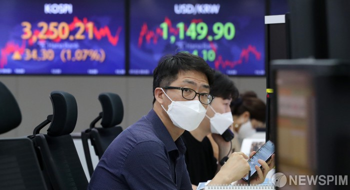 [서울=뉴스핌] 정일구 기자 = 22일 코스피 지수가 전 거래일(3215.91)보다 34.30포인트(1.07%) 오른 3250.21에 마감했다. 코스닥 지수는 전 거래일(1042.03)보다 8.22포인트(0.79%) 상승한 1050.25에 종료했다. 원·달러 환율은 전 거래일(1154.0원)보다 4.1원 내린 1149.9원에 장을 마쳤다. 이날 오후 서울 중구 하나은행 딜링룸에서 딜러들이 업무를 보고 있다. 2021.07.22 mironj19@newspim.com