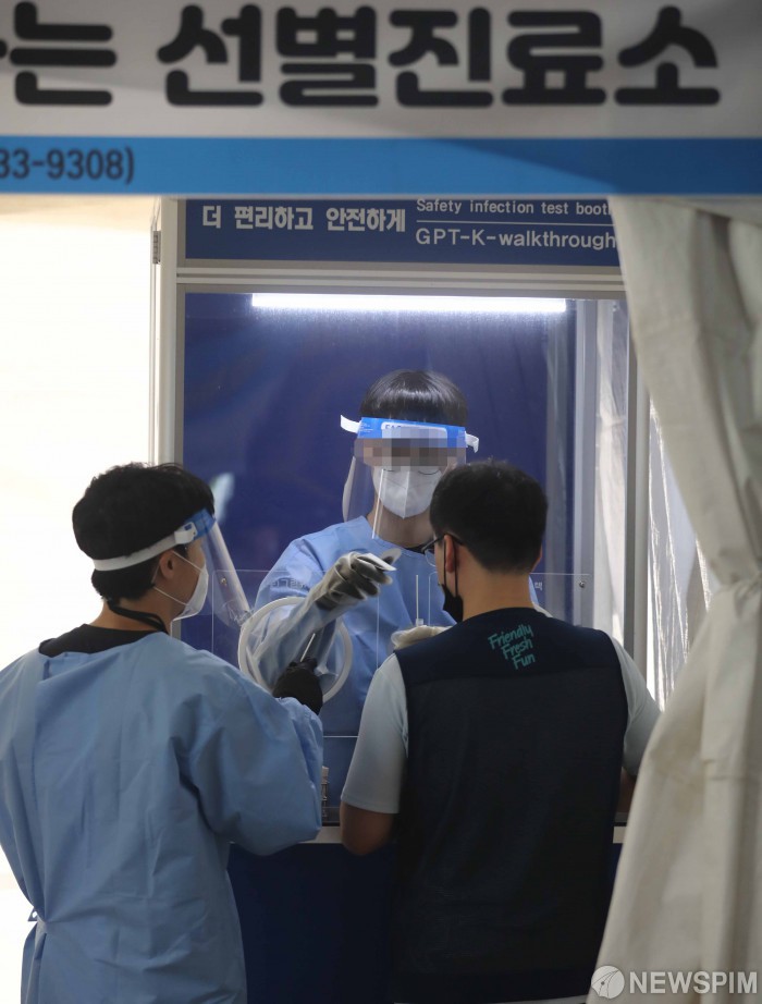 [서울=뉴스핌] 백인혁 기자 = 24일 오후 서울 송파구 서울복합물류단지 내 위치한 서울시 찾아가는 선별진료소에서 근로자들이 검사를 받고 있다. 2021.07.24 dlsgur9757@newspim.com