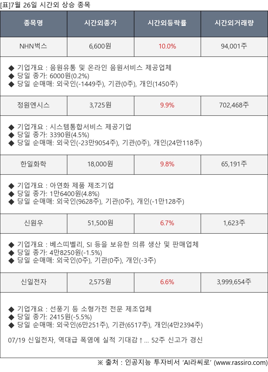 ※ 관련 종목: NHN벅스, 정원엔시스, 한일화학, 신원우, 신일전자