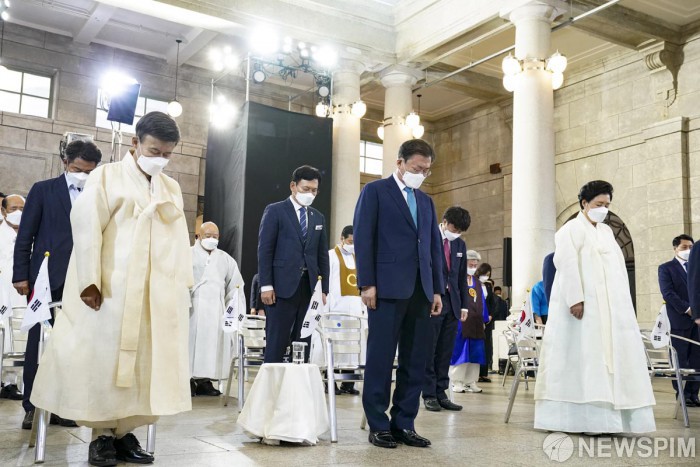 [서울=뉴스핌] 문재인 대통령이 15일 오전 서울시 중구 문화역서울 284에서 열린 제76주년 광복절 경축식에서 순국선열 및 호국영령에 대한 묵념을 하고 있다.[사진=청와대] 2021.08.15 photo@newspim.com