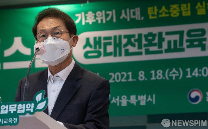 [서울=뉴스핌] 윤창빈 기자 = 조희연 서울특별시 교육청 교육감이 18일 오후 서울 종로구 서울시교육청에서 열린 ‘에코스쿨 생태전환교육파크 조성 업무협약식’에서 인사말을 하고 있다. 2021.08.18 pangbin@newspim.com