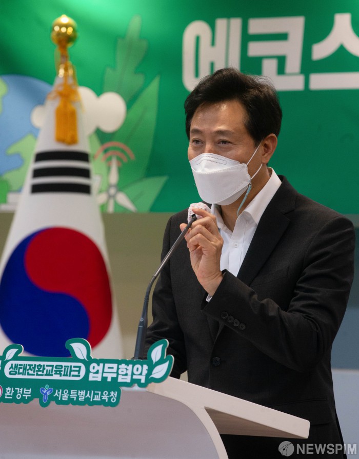 [서울=뉴스핌] 윤창빈 기자 = 오세훈 서울시장이 18일 오후 서울 종로구 서울시교육청에서 열린 ‘에코스쿨 생태전환교육파크 조성 업무협약식’에서 인사말을 하고 있다. 2021.08.18 pangbin@newspim.com