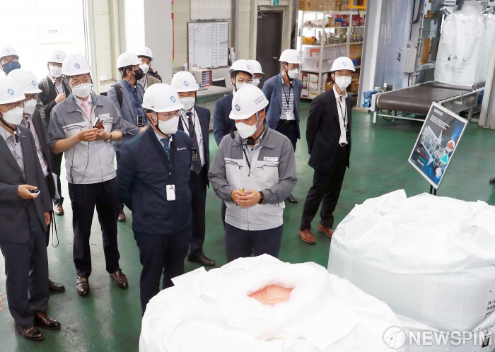 [서울=뉴스핌] 문승욱 산업통상자원부 장관이 19일 오후 전북 군산시 성일하이텍에서 열린 희소금속 전문기업 간담회후 성일하이텍 희속금속 생산 주요시설을 둘러보고 있다. [사진=산업통상자원부] 2021.08.19 photo@newspim.com