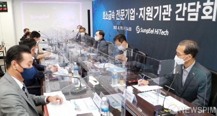 [서울=뉴스핌] 문승욱 산업통상자원부 장관이 19일 오후 전북 군산시 성일하이텍에서 열린 희소금속 전문기업 간담회에서 발언을 하고 있다. [사진=산업통상자원부] 2021.08.19 photo@newspim.com