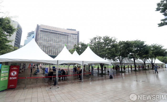 [서울=뉴스핌] 정일구 기자 = 신종 코로나바이러스 감염증(코로나19) 신규 확진자가 엿새 만에 1500명 아래로 떨어진 1418명을 기록한 23일 오후 서울 중구 서울광장에 마련된 임시 선별검사소에서 시민들이 검사를 받기 위해 줄지어 서있다. 2021.08.23 mironj19@newspim.com